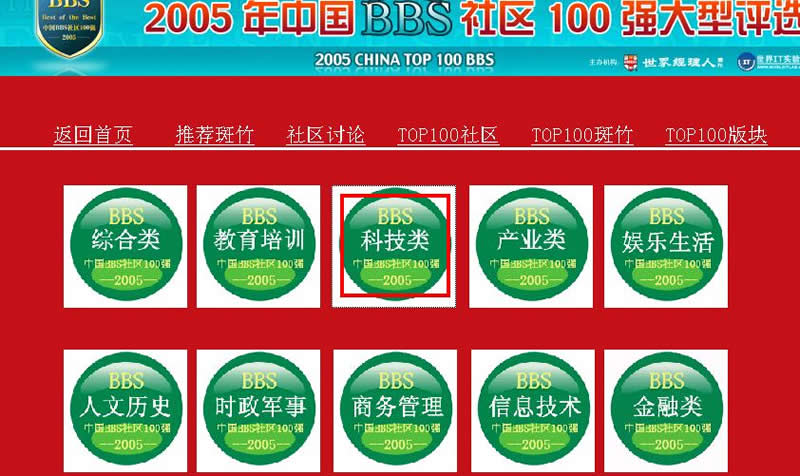 2005年“中国BBS社区100强”大型评选活动于2005年8月19日开始,除社区100强外,另外还将评选出5个单项大奖: “中国100最佳BBS站长(版主) ” 、“中国10大最具投资价值社区”、“中国10大最具影响力社区”、“中国10大最具创新力社区”、“中国10大成长最快的社区”。