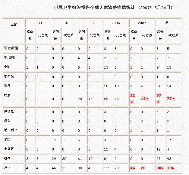 世界卫生组织报告全球人禽流感疫情统计 (2007年5月24日)