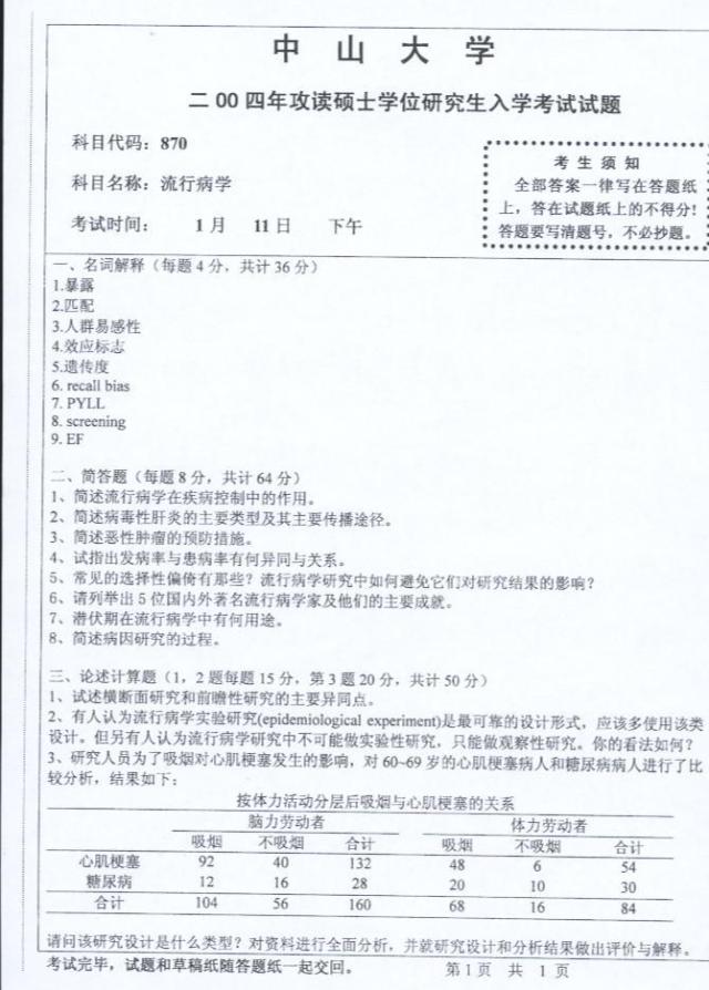 中山大学2004考研试题,流行病学