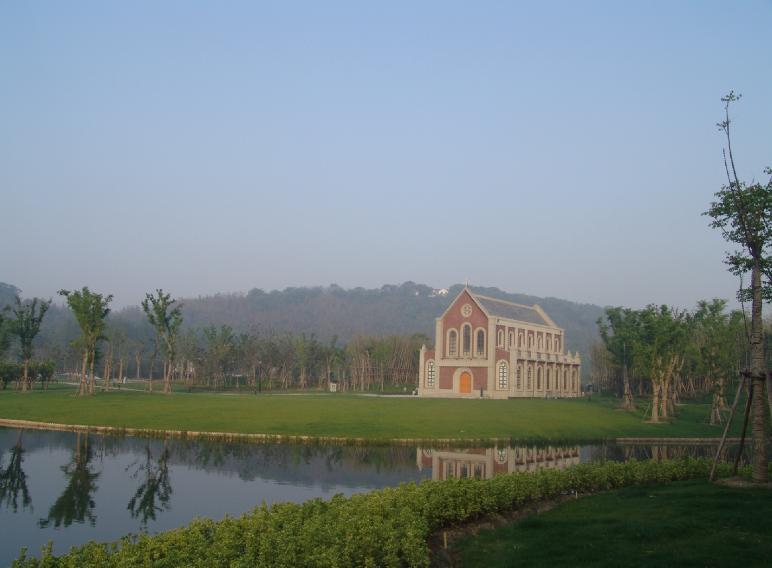 松江某酒店晨曦中的小教堂,背后的山就是佘山了。