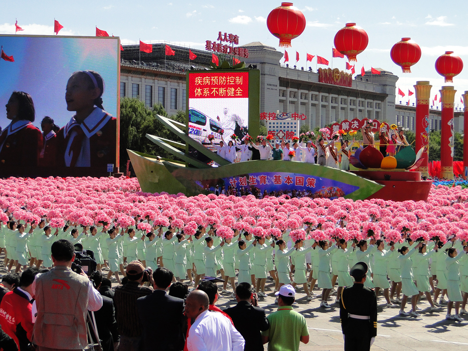 在60周年国庆游行队伍的人口与卫生彩车上, 11名公共卫生与医护人员代表全国700万医务工作者参与了共和国历史上的这一空前盛典。