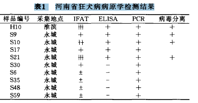 (2)病原学检测:2005年初,在近年来疫情活跃的豫东地区尝试开展犬中狂犬病毒调查,于永城、淮滨县(市)收集市售屠宰犬脑组织标本100(头)份,结果见表1。