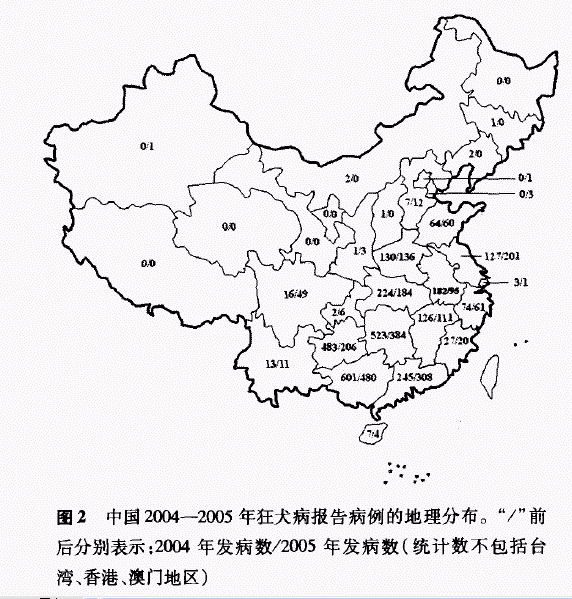 2.地理分布:自1980年至2005年,全国疫情监测表明,除青海无病例报告外,全国其他各省市均有病例报告。但各地发病数差异较大,过去 25年间发生的病例主要分布在湖南 、广东、四川、广西、贵州、江西、湖北、安徽、山东、河南、江苏 、河北、福建、云南、辽宁等省份。25年间 15个省份的累计发病数均在1000例以上,发病数约占全国发病总数的94%,其中湖南、广东、四川、广西四省区每省的发病数超过了8000例。2004--2005年全国各省市自治区狂犬病的发病数见图2。 在西北地区狂犬病的发病率则很低,甘肃 、宁夏、新疆、西藏等省份有时全年无病例或只有几个病例发生;山西、内蒙、吉林、黑龙江等省份界于两地区之间。另外,我国北京、上海、天津等大城市的发病率也相对较低。 虽然河北、辽宁等省市在 1980--1995年间发病率较高,但1996年以后发病率始终保持在较低的水平;而湖南、广西、江西、广东、江苏、贵州、湖北、安徽等省的发病率仍保持在较高水平,或在经历1995--1998年的低发期后,疫情显著回升。 值得注意的是近年来狂犬病疫情正由长江以南的传统高发地区向周边地区扩散(图2),2004--2005年河南省报告狂犬病在130例以上,山东与四川省的疫情也明显回升。