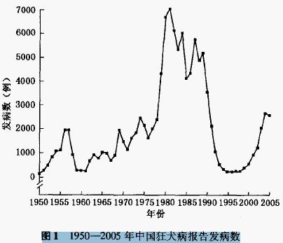 狂犬病是一种由狂犬病毒引起的人兽共患传染病。几乎所有的温血动物对狂犬病毒易感,但犬类是本病的主要宿主,在携带和传播狂犬病过程中起主要作用。人狂犬病通常由患病动物咬伤或黏膜接触后唾液中的狂犬病毒侵入体内而发生感染。狂犬病是迄今为止人类病死率最高的急性传染病,一旦发病,死亡率高达100%。全世界每年约有35 000~50 000人死于狂犬病,主要分布在亚洲、非洲和拉丁美洲等发展中国家 。 中国在 2000多年前就有狂犬病的记载 ,也是受狂犬病危害最为严重的国家之一。狂犬病在我国曾一度得到有效控制,但近年来,狂犬病不但疫情快速回升,而且出现了一些新的流行特征。笔者就中国狂犬病的流行状况、特征及其趋势进行分析与探讨,为我国狂犬病的防制对策提供依据。 中国狂犬病流行病学特征