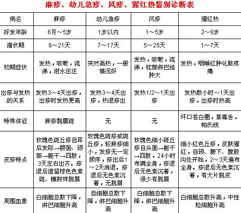 【转帖】麻疹、幼儿急疹、风疹、猩红热鉴别诊断表