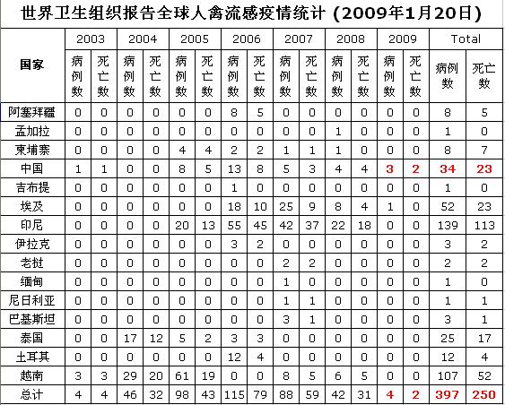 世界卫生组织报告全球人禽流感疫情统计 (2009年1月20日)