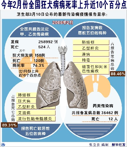 2006年2月,全国共报告法定甲、乙类传染病25万余例,其中狂犬病发病158例,死亡120例,病死率达75.9%,比1月份的66.7%上升近10个百分点.